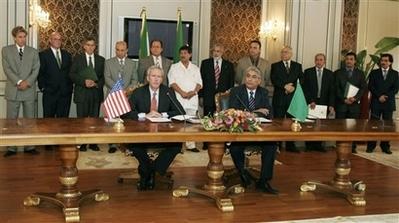 負(fù)責(zé)中東外交事務(wù)的美國(guó)助理國(guó)務(wù)卿韋爾奇與利比亞外交部美洲事務(wù)負(fù)責(zé)人費(fèi)圖里,分別代表兩國(guó)政府在協(xié)議上簽字。韋爾奇表示,這是為兩國(guó)關(guān)系開啟新一頁(yè)的協(xié)議;費(fèi)圖里說,這是經(jīng)過漫長(zhǎng)而且筋疲力竭的談判后的成果。