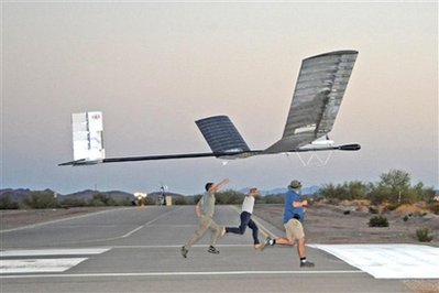 據(jù)香港《文匯報(bào)》報(bào)道,這架名為“Zephyr(微風(fēng))”的無(wú)人偵察機(jī),由英國(guó)國(guó)防公司Qinetiq制造!癦ephyr”機(jī)身由碳纖維制造,只重30公斤,飛行高度達(dá)6萬(wàn)英尺,時(shí)速可達(dá)112公里,能抵受攝氏45度至零下75度的溫差!癦ephyr”60英尺(18米)長(zhǎng)機(jī)翼上的太陽(yáng)能充電板,能為它提供源源不絕的能源。
