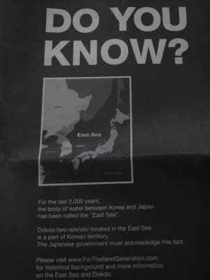 據(jù)《朝鮮日報(bào)》報(bào)道,韓國門戶網(wǎng)站Daum表示,用11萬余名網(wǎng)民募捐的資金,于25日(當(dāng)?shù)貢r(shí)間)在《華盛頓郵報(bào)》刊登了整版的獨(dú)島廣告。廣告執(zhí)行者由徐景德?lián),他曾?月份在歌手金長勛等人的贊助下,在《紐約時(shí)報(bào)》刊登了獨(dú)島宣傳廣告“DO YOU KNOW?(你知道嗎)”。