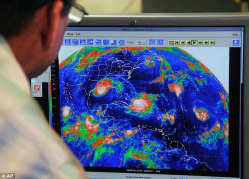 美國(guó)國(guó)家颶風(fēng)中心氣象專家在查看一幅颶風(fēng)衛(wèi)星照片,顯示出古斯塔夫和漢娜颶風(fēng)。