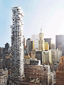 中新網9月15日電 為北京奧運會“鳥巢”體育館進行設計工作、受到各方贊嘆的兩位瑞士建筑設計師赫爾佐格(Jacques Herzog)和德默隆(Pierre de Meuron),將會把他們的創(chuàng)意帶到紐約。他們參與在紐約市內興建一座透明玻璃摩天大樓。當這座建筑物在后年建成后,驟眼看好像一層層單位半浮懸在空中,令人類幻想中的“空中樓閣”活現(xiàn)眼前。