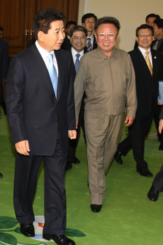 資料圖:去年10月3日,韓國總統(tǒng)盧武鉉與朝鮮國防委員長金正日舉行首次首腦會談時,就金正日前一天親自出來迎接表達謝意,而金正日對此以“我又不是患者”來回應(yīng),再次表現(xiàn)出其幽默的一面。
