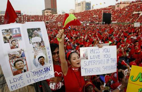 周六晚,多達(dá)五萬名他信支持者齊集在曼谷一個球場內(nèi),參加集會。身在海外的他信發(fā)表預(yù)先錄制的錄像講話,向支持者說,如果軍方領(lǐng)袖繼續(xù)干涉政事,泰國的混亂局面將會永無止境,延續(xù)下去。臺下的群眾大多穿上紅衣,以示團結(jié),他們聽到他信的講話都?xì)g呼喝采。