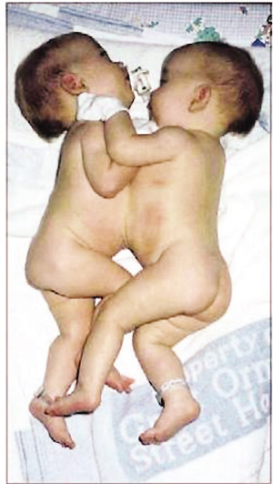據(jù)統(tǒng)計,連體雙胞胎的出生率在新生兒中僅為20萬分之一。喬安最不愿意做的一個抉擇是,在2個寶寶中選擇一個存活,同時犧牲另一個。為此她終日祈禱。1997年4月6日,喬安在曼徹斯特市的圣瑪麗醫(yī)院經(jīng)剖腹產(chǎn)生下一對連體女嬰,取名為尼芙和愛法。喬安回憶稱:“看到2個小寶寶后,我的第一反應(yīng)是她們是如此正常,僅僅是‘粘連’在一起而已。她們出生時互相擁吻著,其中一個的嘴唇緊貼著另一個,可愛極了。”