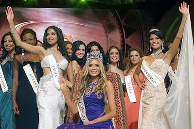 俄羅斯小姐Ksenya Sukhinova(中),印度小姐Parvathay Omanakuttan(前左)及特立尼達和多巴哥小姐Gabriel Walcott。