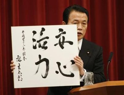 中新網(wǎng)1月6日電 據(jù)星島環(huán)球網(wǎng)報(bào)道,日本首相麻生太郎4日用了39秒鐘時(shí)間寫(xiě)下了“安心活力”四個(gè)字作為自己新年的執(zhí)政目標(biāo),并于記者會(huì)上進(jìn)行了公布。然而,這一舉動(dòng)并沒(méi)有獲得國(guó)民的掌聲,卻很快引來(lái)了輿論的嘲弄,因?yàn)椴簧偃苏J(rèn)為麻生寫(xiě)的四個(gè)字中,至少一個(gè)字是錯(cuò)別字。