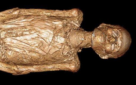 據(jù)英國媒體報道,美國芝加哥大學科學家日前利用X光掃描設備掃描的這具木乃伊被認為是公元前800年,埃及底比斯神廟祭司時一名唱歌婦女的尸體?脊艑W家從安放該木乃伊的棺材上的雕刻文字認定該木乃伊名叫梅熱薩姆(Meresamun)。從掃描的圖像上可看到當時包裹尸體時使用的制作精良的裝飾品。