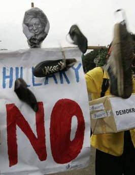 中新網(wǎng)2月20日電 美國國務(wù)卿希拉里亞洲之行18日到訪第二站印度尼西亞首都雅加達(dá)。由于前總統(tǒng)布什與穆斯林關(guān)系交惡,希拉里人還沒抵達(dá)雅加達(dá),當(dāng)?shù)氐拿绹笫桂^外就爆發(fā)激烈抗議,抗議民眾還以丟鞋子的方式,不歡迎希拉里來訪。