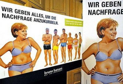 據(jù)法新社報(bào)道,德國(guó)一家內(nèi)衣公司5月1日在柏林著名商業(yè)街庫(kù)達(dá)姆街推出了一個(gè)1000平方英尺的巨幅電子廣告牌,廣告牌上是德國(guó)政治家著內(nèi)衣的形象,其中包括德國(guó)總理默克爾,她身穿一套紫色胸罩和運(yùn)動(dòng)短褲。廣告牌上的文字寫著:“我們盡全力增加需求!