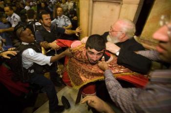 亞美尼亞教士干脆堵住門口,不準任何人進出,使得以色列軍警只能使出強力手段拉開人群。突然間有人朝著軍警丟擲棍棒,被激怒的警察馬上追逐肇事份子,使得現(xiàn)場更加混亂。