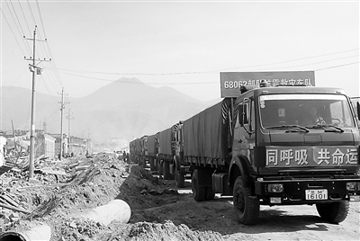 記者看到,這兩支車隊(duì)中既有拉運(yùn)物資的軍用汽車,也有地方運(yùn)輸公司的大噸位加長卡車,還有載有建筑工人的中鐵建設(shè)集團(tuán)的專用運(yùn)輸車等,遠(yuǎn)遠(yuǎn)看去,車隊(duì)就像一條長龍,一眼望不到尾。建筑大軍浩浩蕩蕩開進(jìn)玉樹災(zāi)區(qū)的場景令記者既震撼,又振奮。
