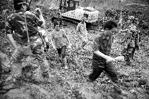 負(fù)責(zé)挖掘的武警交通直屬工程部的周偉表示,為了確保安全,避免次生災(zāi)害,大型挖掘機(jī)的挖掘工作到下午四點(diǎn)左右才開始。他說,為了保證遺體的完整,他們挖掘的時(shí)候都會(huì)非常小心。在現(xiàn)場,由于垮塌的直線距離幾百米,幾臺(tái)挖掘機(jī)分層次挖掘。挖出一大鏟泥土后,從高處落下,看是否有遺體存在。