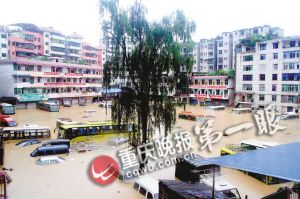 前晚9時(shí)許,酉陽(yáng)縣城開始下起暴雨。昨晨,酉城河水也漫過河床,涌向縣城主街的低洼角落。至上午10時(shí)許,縣城東風(fēng)壩、城北車站、小商品一條街、桃花源中路等街道門面進(jìn)水,水深1.5米左右,酉陽(yáng)報(bào)社被淹,停放在街邊、車站內(nèi)的許多車輛被水淹沒。