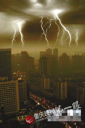 昨上午10時(shí)左右,大片的黑色云朵從北向南逼近并覆蓋主城上空,原本已放亮的天空,慢慢地變黑,短短10多分鐘,整個(gè)主城區(qū)已經(jīng)宛如黑夜,馬路上的車輛紛紛打開車燈,緩慢行駛!疤旌凇睕]多久,閃電劃破“夜空”,驚雷緊隨而至,并未經(jīng)過鋪墊,大雨如注鋪天蓋地砸向地面,突如其來(lái)的暴雨,致使主城很多地方的道路產(chǎn)生積水。