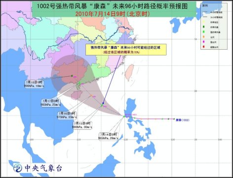 中新網(wǎng)7月14日電 中央氣象臺今天10時發(fā)布的臺風(fēng)黃色預(yù)警稱:今年第2號強熱帶風(fēng)暴“康森”的中心已于今天上午8時由菲律賓呂宋島西南部移入中國南海東部海面,9時其中心距海南省文昌市東南方大約1090公里(北緯14.8度、東經(jīng)119.8度),中心附近最大風(fēng)力有10級(28米/秒),中心最低氣壓985hPa。