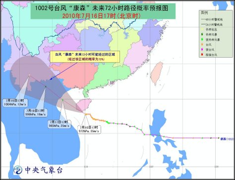 預(yù)計,“康森”將以每小時15-20公里的速度向西偏北方向移動,將于16日夜間在海南三亞到樂東一帶沿海登陸;也有可能從海南南部近海擦過。