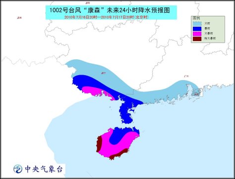 受其影響,16日晚上到17日白天,南海西北部、瓊州海峽、海南省及其沿海、廣東西部沿海、廣西沿海、北部灣將有7~10級大風(fēng),“康森”中心經(jīng)過的附近海面或地區(qū)的風(fēng)力可達(dá)11~12級,部分海域或地區(qū)陣風(fēng)可達(dá)13~14級;廣東西南部、廣西南部、海南將有大到暴雨,其中海南、廣西南部的部分地區(qū)有大暴雨,海南南部和西部的局地有特大暴雨。