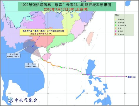 預計,“康森”將以每小時20公里左右的速度向西北方向移動,將于17日下午到夜間在越南北部沿海再次登陸。