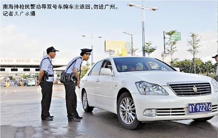 由于參與配合廣州“限行”的南海交警人手有限,而此時又有大量雙號車進(jìn)入廣州,7時30分許,造成五丫口收費站一度擁堵,正在一旁執(zhí)行任務(wù)的兩名桂城派出所的持微型沖鋒槍的民警看到后,立即加入勸說隊伍,勸說雙號車車主不要進(jìn)入廣州。同時,他們還向雙號車的車主派發(fā)“限行”演練的通告,向部分車主解釋“限行”措施。