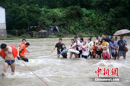 中新網(wǎng)衢州7月18日電(記者 江耘 通訊員 饒小飛)今天下午,浙江衢州石梁鎮(zhèn)坎底村水庫(kù)因暴雨致水位突漲,18名正在水庫(kù)里休閑渡假的游客被困水庫(kù)中央,其中7人是小孩。后在衢州柯城消防架設(shè)“安全通道”下,18名游客被安全救出。