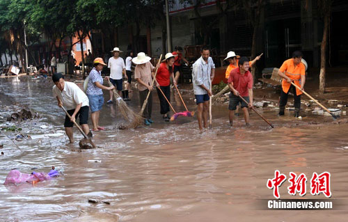 中新網(wǎng)廣安7月20日電(廖小兵 李勇) 20日凌晨,四川廣安城區(qū)160年難遇的洪峰慢慢消退,洪水過(guò)后,城區(qū)的清淤、防疫、災(zāi)后安置成了當(dāng)前抗洪工作的重中之重。當(dāng)?shù)匮杆俳M織機(jī)關(guān)干部、公安、消防、武警、志愿者以及受災(zāi)群眾近萬(wàn)人迅速投入到清理淤泥、防疫工作當(dāng)中,爭(zhēng)取早日恢復(fù)往日的生活秩序。