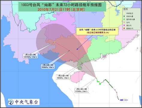 中新網(wǎng)7月21日電 中央氣象臺(tái)7月21日18時(shí)發(fā)布臺(tái)風(fēng)橙色預(yù)警:今年第3號(hào)強(qiáng)熱帶風(fēng)暴“燦都”于21日17時(shí)加強(qiáng)為臺(tái)風(fēng),17時(shí)其中心位于海南省文昌市東南方大約210公里的南海北部海面上,就是北緯19.0度,東經(jīng)112.8度,中心附近最大風(fēng)力有12級(33米/秒),中心最低氣壓為975百帕。