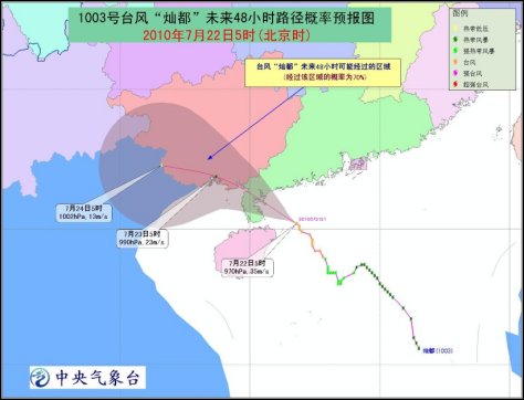 中新網(wǎng)7月22日電 據(jù)中央氣象臺消息,攜風帶雨,“燦都”的腳步正一步步逼近,中央氣象臺今日凌晨繼續(xù)發(fā)布臺風橙色預(yù)警,預(yù)計今日中午前后“燦都”將在廣東徐聞到電白一帶沿海登陸。華南沿!皣狸囈源薄⒓磳⒔邮芤粓隹耧L暴雨的考驗。另外,前期降水較強的東北地區(qū)雨勢將有所緩和。