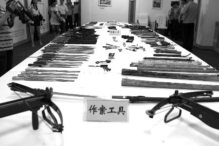 現(xiàn)場最多的作案工具還是刀,三尺長一掌寬的板刀、砍刀約40把,大小匕首近50把。在刀具旁邊擺著兩把弩,民警介紹說,弩的裝填時間很長,攜帶也不方便,但是它的射程很遠(yuǎn),殺傷力強(qiáng),“在利益沖突比較嚴(yán)重的時候,曾有黑惡勢力團(tuán)伙用弩對射”。