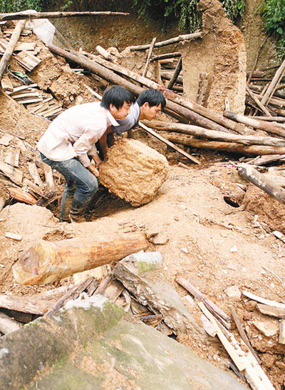 倒塌的房屋旁邊,靠西的一段墻倔強地矗立著,房屋其他部分完全失去了原貌。七八個男勞力趕來幫忙,加上自己的兩個弟弟,一起動手,試圖從這里刨出弟弟邵祖發(fā)的媳婦。25日,他的媳婦就是從房屋的廢墟下被刨出來的。