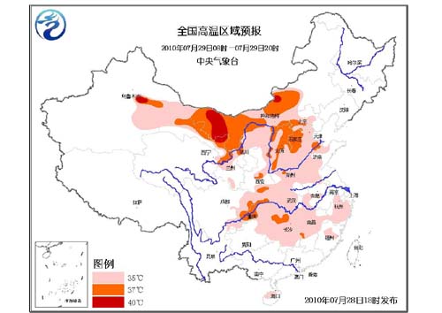 中央氣象臺(tái)發(fā)布的高溫黃色預(yù)警稱:明天(29日)白天,北京、天津、河北大部、山西、陜西關(guān)中地區(qū)和東部、寧夏中北部、河南大部、山東中西部、安徽北部、湖北、四川盆地東部、重慶、貴州東北部、湖南大部、江西中北部、浙江大部、福建北部、海南北部等地有35℃以上的高溫天氣,局地最高氣溫可達(dá)37~38℃;內(nèi)蒙古中西部、甘肅大部、新疆吐魯番盆地及南疆盆地東部等地將有35~37℃的高溫天氣,局地最高氣溫可達(dá)40℃以上。