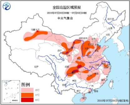 預計,明天白天,新疆吐魯番盆地及南疆盆地東部、內蒙古西部偏南地區(qū)、甘肅大部、青海東北部、寧夏大部、陜西大部、華北大部、黃淮、江淮大部、江漢、江南大部、四川盆地、重慶、貴州東北部、海南大部等地有35~37℃的高溫天氣,其中,重慶、甘肅中部、吐魯番盆地等地局部最高氣溫可達40℃以上。