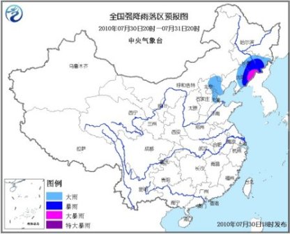 預(yù)計(jì),7月30日20時(shí)到7月31日20時(shí),河北東北部、京津地區(qū)東部、遼寧東部、吉林中南部等地有大雨或暴雨,其中,遼寧東部、吉林南部等地的部分地區(qū)有大暴雨;上述局地并伴有短時(shí)雷雨大風(fēng)等強(qiáng)對(duì)流天氣。