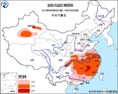 中央氣象臺2010年8月3日10時繼續(xù)發(fā)布高溫橙色預警: