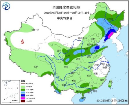 8日08時(shí)至9日08時(shí),新疆天山地區(qū)和南疆西部、西藏大部、青海東北部和南部、西北地區(qū)中東部、內(nèi)蒙古中東部、東北、華北、黃淮大部、江淮西部、江漢、江南中西部、華南大部、西南以及臺灣等地有小到中雨或陣雨,其中,黑龍江南部、吉林大部、遼寧大部、河北中南部和東部、北京東部、天津、山東北部以及內(nèi)蒙古東部的部分地區(qū)、海南大部、臺灣南部等地有大雨或暴雨,吉林東南部、遼寧中東部等地的局地還將有大暴雨;上述部分地區(qū)并伴有短時(shí)雷雨大風(fēng)等強(qiáng)對流天氣。內(nèi)蒙古中東部、東北西部等地有4~6級風(fēng)。黃海、東海、臺灣海峽將有5~8級風(fēng)。