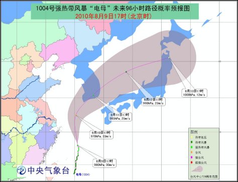 中新網(wǎng)8月9日電 據(jù)中央氣象臺預報稱,中央氣象臺8月9日18時發(fā)布臺風黃色預警:今年第4號熱帶風暴 “電母”(DIANMU,名字來源:中國,名字意義:神話中的雷電之神)于8日晚在臺灣以東洋面上生成,9日下午加強為強熱帶風暴。9日17時其中心位于浙江省舟山市東南方大約390公里的東海海面上,就是北緯28.0度,東經(jīng)125.5度,中心附近最大風力有11級(30米/秒),中心最低氣壓為980百帕。