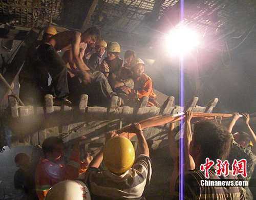 中新網汶川8月11日電(劉忠俊 李濤)11日凌晨4時32分,四川汶川縣草坡鄉(xiāng)草坡2號橋旁一在建隧道發(fā)生垮塌,一工人被巨石壓于其下,經過消防官兵2個多小時的緊張救援被壓工人成功獲救。