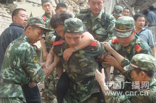 黑夜中,不少戰(zhàn)士的手和腳被埋在泥石中的鋼筋、瓦礫刺破,鮮血直流,官兵心中只有一個念頭:對廢墟下每個可能幸存的生命,不拋棄,不放棄!一名婦女被救出了,頭上血流不止,戰(zhàn)士郭永寬撕開自己的背心替他包扎。戰(zhàn)士田維宇見到一個被救的老人凍得發(fā)抖,脫下自己身上僅有的一件衣服給她穿上。班長宋楠楠長時間用手挖掘尸體,手劃破了,鮮血直流,他顧不上包扎連續(xù)戰(zhàn)斗。十幾個小時沒進一粒食,沒喝一口水,沒合一下眼,50名參戰(zhàn)官兵就是憑著100條手臂,在8日第一時間從廢墟中搶救出32條鮮活的生命。