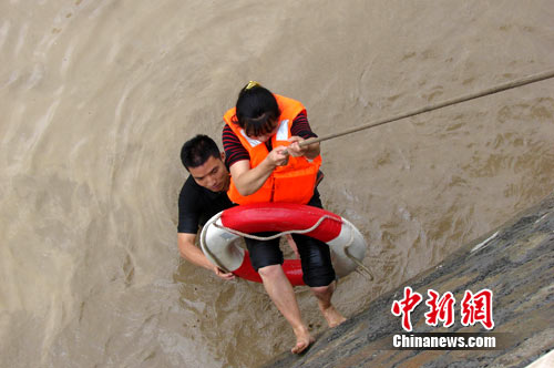 消防官兵搜尋到中攤堡大道,聽到中普建設(shè)楓香樹村安置房與中攤堡安置房交界處傳來求救聲音,利用強(qiáng)光手電筒發(fā)現(xiàn):洪水已將4名來不及疏散的施工人員團(tuán)團(tuán)包圍,工人在樓頂揮手、呼喊求救!安灰,我們馬上想辦法過來救你們”。由于水流很急且到處都是施工隊(duì)挖的暗溝,時間緊迫,消防站余柯政站長來不及多考慮,立即下令,將保險繩拴在消防車上,余站長和劉飛穿上救生衣,綁好安全繩后,帶著救生圈慢慢的游到被困群眾位置,將救生衣為民工穿好后,一邊由消防官兵護(hù)送一邊由在消防車一邊的其余消防官兵牽引安全繩接應(yīng),緊急轉(zhuǎn)移被困群眾。一趟、兩趟、三趟……經(jīng)過近半小時的奮戰(zhàn),成功救出被困工人。