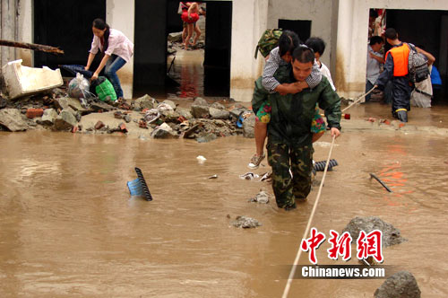 14日中午12點30分,阿壩支隊廖軍支隊長率郭興武參謀長等救援官兵從馬爾康驅車到達汶川徹底關大橋災害現場,通過實地查看和詢問當地群眾得知:汶川沙坪關村上銀杏組處泥石流阻斷河道形成堰塞湖,將國道213線淹沒200余米,最深處達4米。確認車輛、人員短時間尚無通行的可能后,根據查看情形當機立斷,立即組織疏散轉移附近群眾,廖支隊長率領官兵爬山淌水,一戶一戶的走,一個工地一個工地說,使附近260余名群眾和工人安全轉移到地勢較高的安全地段。
