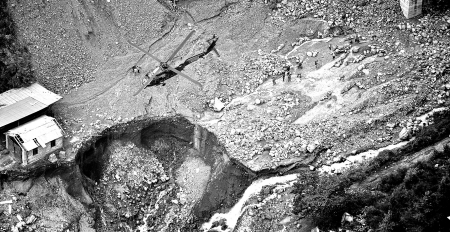 從機艙往下看,翠綠的山體上一道道灰白色的泥石流觸目驚心,曾經的美麗小鎮(zhèn)被泥石流拉開一道巨大的傷口。