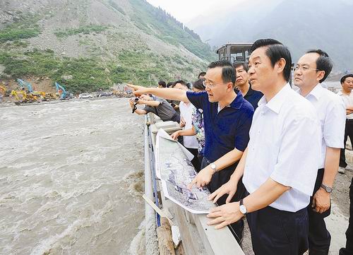 時刻關注汶川縣映秀鎮(zhèn)特大山洪泥石流災害搶險救災工作的省委書記、省人大常委會主任劉奇葆,16日下午再次趕往映秀鎮(zhèn),指導搶險救災工作,強調要不惜一切代價,加快處理岷江河道中的壅塞體,拓寬河面,加大流量,降低水位,盡快讓岷江回歸正常河道,確保映秀鎮(zhèn)安全,確保人民群眾生命安全。