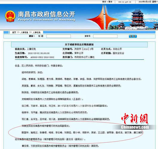 8月23日,中新網(wǎng)記者在南昌市政府信息公開(kāi)網(wǎng)找到南昌市政府發(fā)布的洪府字[2010]5號(hào)文件,該文件名為“關(guān)于邱勝等同志任職的通知”(以下簡(jiǎn)稱(chēng)為“通知”)。通知顯示,南昌市政府任命了一批南昌市工業(yè)和信息化委員會(huì)、市人力資源和社會(huì)保障局、市城市管理委員會(huì)(城市管理行政執(zhí)法局)以及市文化新聞出版局的官員。