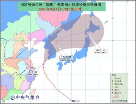 今年第7號(hào)臺(tái)風(fēng)“圓規(guī)”于9月1日13時(shí)在東海北部海面上加強(qiáng)為強(qiáng)臺(tái)風(fēng),17時(shí)其中心位于韓國濟(jì)州西偏南方大約170公里的海面上,就是北緯33.2度、東經(jīng)124.7度,中心附近最大風(fēng)力有14級(jí)(45米/秒),中心最低氣壓為955百帕。