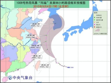 今年第9號熱帶風(fēng)暴“瑪瑙”的中心9月4日17時位于浙江象山東南方大約680公里的洋面上,就是北緯25.7度,東經(jīng)127.3度,中心附近最大風(fēng)力有8級(20米/秒),中心氣壓995hPa。