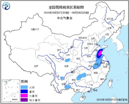 中新網(wǎng)9月7日電 據(jù)中央氣象臺網(wǎng)站消息,中央氣象臺9月7日18時繼續(xù)發(fā)布暴雨藍(lán)色預(yù)警:9月7日20時到8日20時,山東中南部、安徽大部、江蘇北部和西部、湖北東部、湖南中部偏西地區(qū)、貴州東部、甘肅東南部、川西高原北部、云南東南部等地有大雨或暴雨,其中,山東東南部和江蘇北部的局部地區(qū)有大暴雨;上述部分地區(qū)并伴有短時雷雨大風(fēng)等強(qiáng)對流天氣。