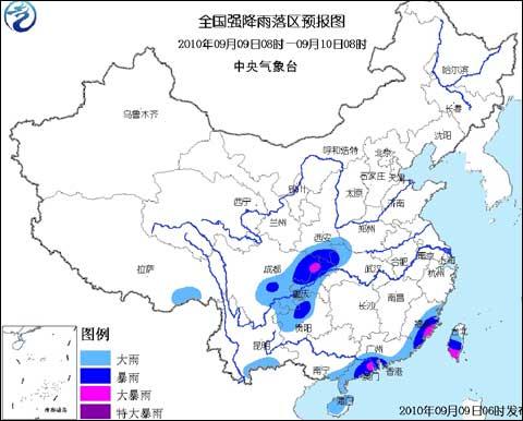 9月9日08時(shí)到10日08時(shí),四川盆地、川西高原東南部、陜西南部、重慶大部、貴州中北部、湖北西北部、福建東部、廣東東部和南部、臺灣大部、廣西南部、海南等地有大雨或暴雨,其中,四川盆地東北部、福建東南部沿海、臺灣南部、廣東西南部等地的局部地區(qū)有大暴雨。另外,西藏東南部、云南南部等地的部分地區(qū)有大雨。上述局部地區(qū)并伴有短時(shí)雷雨大風(fēng)或冰雹等強(qiáng)對流天氣。