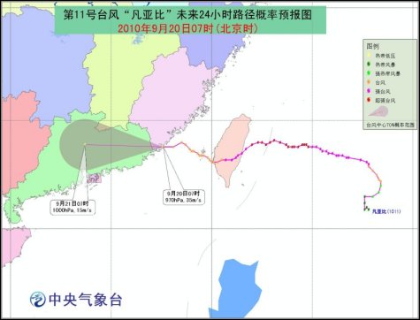 中央氣象臺預計,“凡亞比”將以每小時20公里左右的速度向繼續(xù)偏西方向移動,強度逐漸減弱。