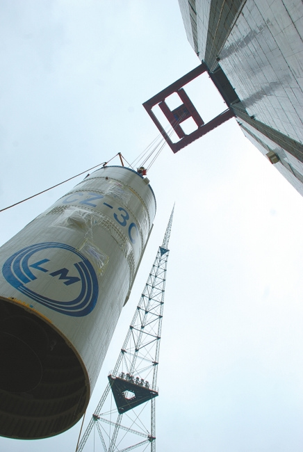 12日上午,發(fā)射場晴空萬里,即將發(fā)射“嫦娥二號(hào)”的2號(hào)發(fā)射工位成為發(fā)射場的關(guān)注焦點(diǎn),首日的火箭轉(zhuǎn)場工作順利完成,一級(jí)火箭以及助推在塔架發(fā)射臺(tái)上順利“會(huì)師”,馬上要進(jìn)行二、三級(jí)吊裝工作。