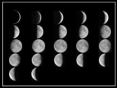 月球位于日、地之間時(shí)叫做“朔”,月球暗的半個(gè)球朝向地球,我們看不到它。朔之后的一兩天,鐮刀狀的新月在傍晚西方的天空中露面,凸面向著落日的方向。以后月球相對于太陽逐漸向東移動(dòng),亮的部分日益擴(kuò)展。五六天以后成了半圓形,這時(shí)的月相稱為“上弦”,日落時(shí)月球在天子午線附近。再經(jīng)過7天,便到了“望”(滿月),月球與太陽遙遙相望,我們看到的是一輪明月于傍晚東升,在晨曦中西落,將黑夜照耀得如同白晝一般。滿月以后,圓輪的西部日益虧缺。到“下弦”時(shí),呈半圓形,月球到半夜才升起。和上弦月相反,下弦月是東邊半個(gè)圓被照亮。下弦以后,半圓繼續(xù)虧缺,成為黎明前掛在東方天空的一絲殘?jiān)。它愈來愈接近太陽,終于跑到和太陽相同的方向,朔又來臨了。