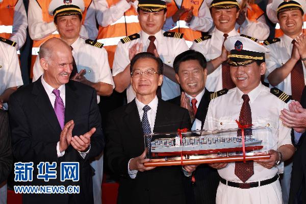 隨后,中希兩國(guó)總理又來(lái)到停靠在碼頭邊上的“中遠(yuǎn)太倉(cāng)”號(hào)集裝箱貨輪旁。這艘可裝載10000個(gè)標(biāo)準(zhǔn)箱的集裝箱貨輪,由中遠(yuǎn)集團(tuán)旗下的南通中遠(yuǎn)川崎公司自主設(shè)計(jì)建造。溫家寶和帕潘德里歐走到船邊,看望了船員和碼頭工人,并與他們?cè)谳喆院嫌。船長(zhǎng)向兩國(guó)總理贈(zèng)送了“中遠(yuǎn)太倉(cāng)”輪的船模。
